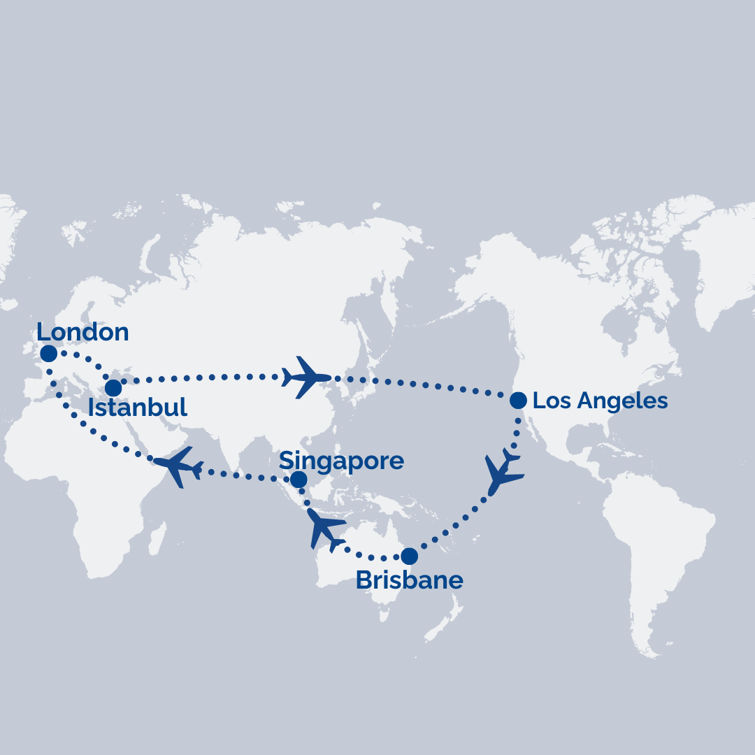 Brisbane → Singapore → Istanbul [Transit] → London → Istanbul → Los Angeles → Brisbane